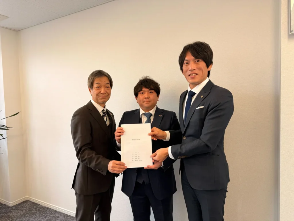 左:㈱アラキ工務店 前社長 荒木勇 / 中央:新社長 柴田秀俊 / 右:㈱大滝工務店 社長 大滝 雄介